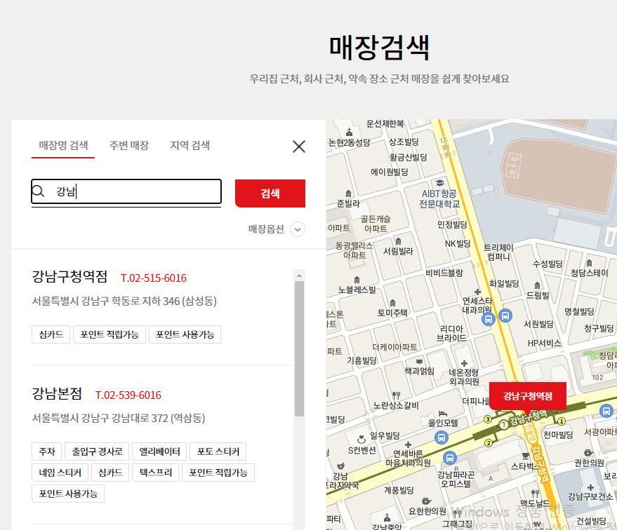 위치 정보에 동의했다면 주변 매장을 찾아볼 수 있고, 지역 검색, 매장명을 직접 검색해 볼 수도 있습니다. 매장이름은 정확히 모르더라도 지역구만 어느정도 알고 있다면 검색해 볼 수 있습니다.